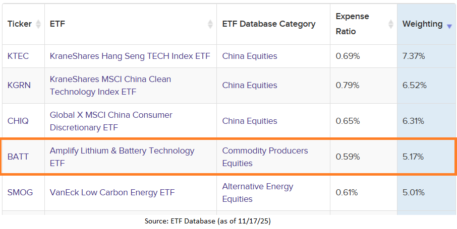 BATT currently has just over a 5% allocation to BYD, which is higher versus a comparative ETF like the Global X Lithium & Battery Tech ETF (LIT) (it has a 3.5% allocation as of November 14). Those looking for heavier exposure will have to enter ETFs that focus on Chinese equities like the KraneShares MSCI China Clean Technology Index ETF (KGRN) or KraneShares Hang Seng TECH ETF (KTEC). BATT keeps investors within the lithium-focused space while also gaining exposure to companies like BYD that can offer global benefits.
