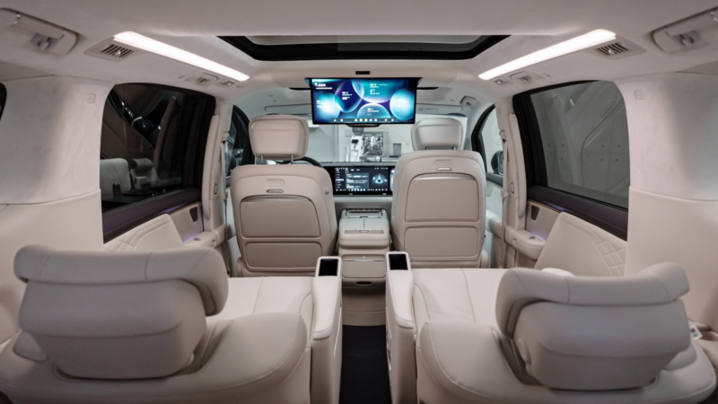 The interior of the Buick GL8 Encasa EV offers seven seats with a 2+2+3 layout. This car was designed for the high-end market. As a result, it has a suede-covered roof and pillars, and three large displays in the center console. A 10.25-inch LCD cluster and a 50-inch augmented reality head-up display sit behind the steering wheel. There is a 16.3-inch screen for the driver, and the same monitor for the front passenger.