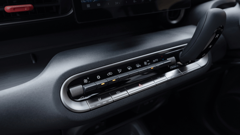 The BYD Racco has a floating touchscreen and an LCD instrument cluster. There is a practical block of physical buttons to manage climate control. The BYD Racco also has a 12V, a USB, and a Type-C charging ports. The Racco’s center console has a storage space on top and a glovebox. Another storage compartment is located in the center tunnel.