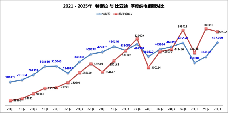 According to data compiled by automotive blogger “Tongkuai Shuchang” (痛快舒畅), BYD’s cumulative pure electric vehicle sales reached 1.6059 million units through Q3 2025, compared to Tesla’s 1.2179 million units during the same period. This gives BYD a substantial lead of approximately 388,000 vehicles over its American rival.
