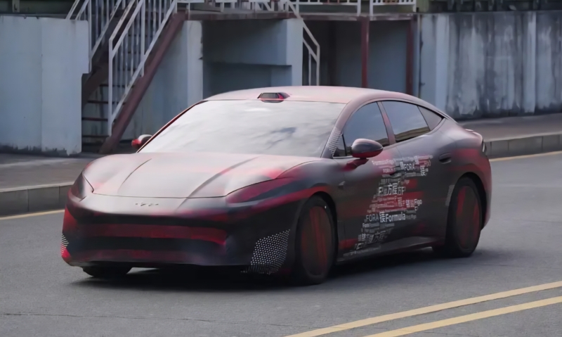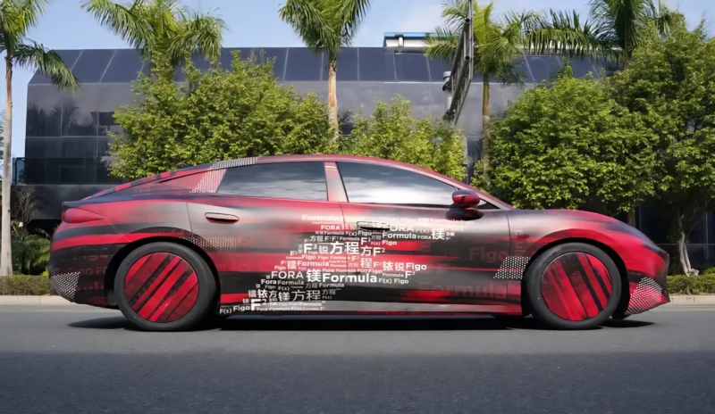 The camouflage wrap features text including “Mei,” “Formula,” “F(x),” and “FORA,” which could potentially be included in the “candidate list” for the new car’s name.