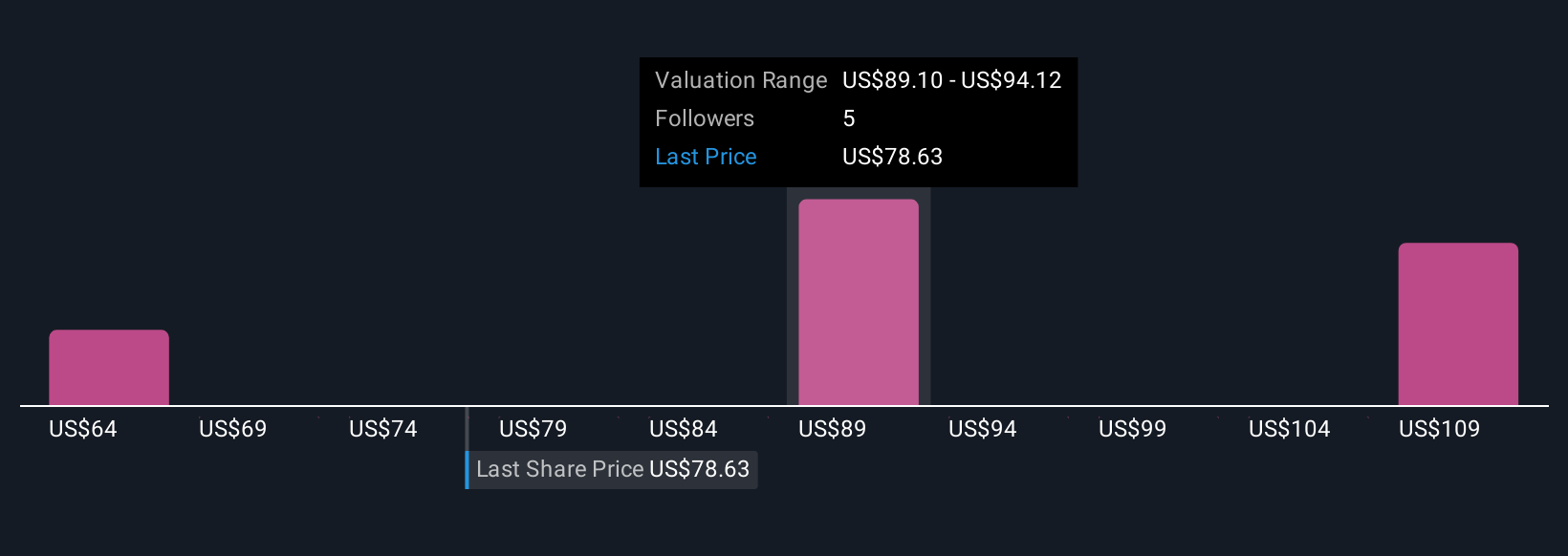 Four fair value estimates from the Simply Wall St Community span from US$64.03 to US$114.18 per share. While community perspectives vary widely, the immediate lack of significant growth drivers could lead to differing expectations about Boyd’s future performance.