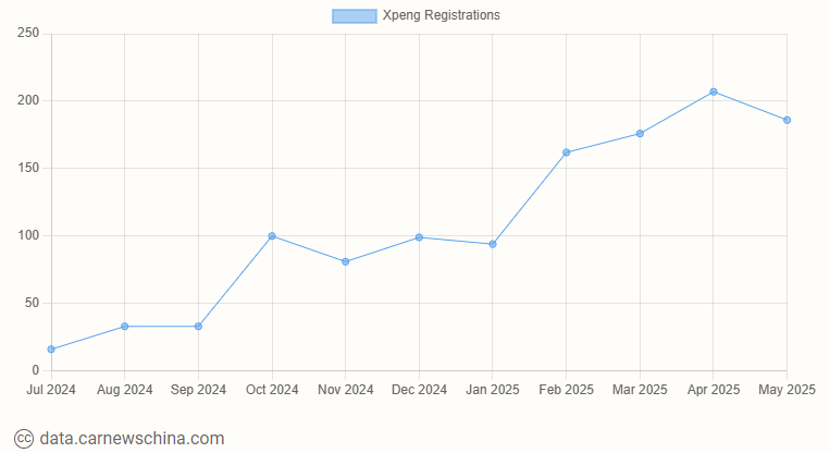 Volkswagen-backed Xpeng registered 186 vehicles, down 10.1% from 207 units in April.