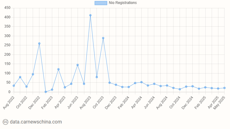 So far in 2025 (January-May), Nio sold 105 cars in Germany, down 44.7% from the same period in 2024.