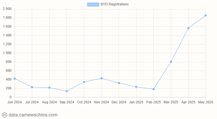 BYD registered 1,857 vehicles, up 18.6% from 1,566 units in April and up 824% from 201 vehicles in the same month last year.
