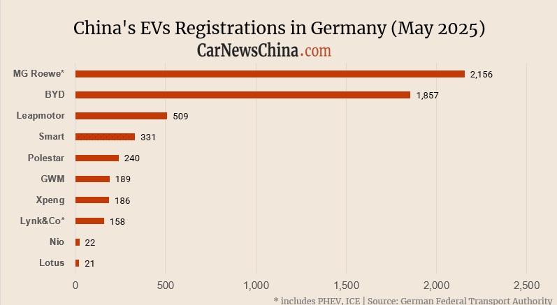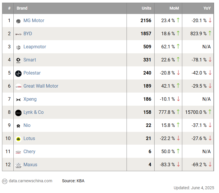 MG got the first spot with 2,156 registered vehicles, up 23.4% from 1,747 units in April and down 20% from 2,699 vehicles in the same month last year. MG sales also include PHEV vehicles and some ICE cars.