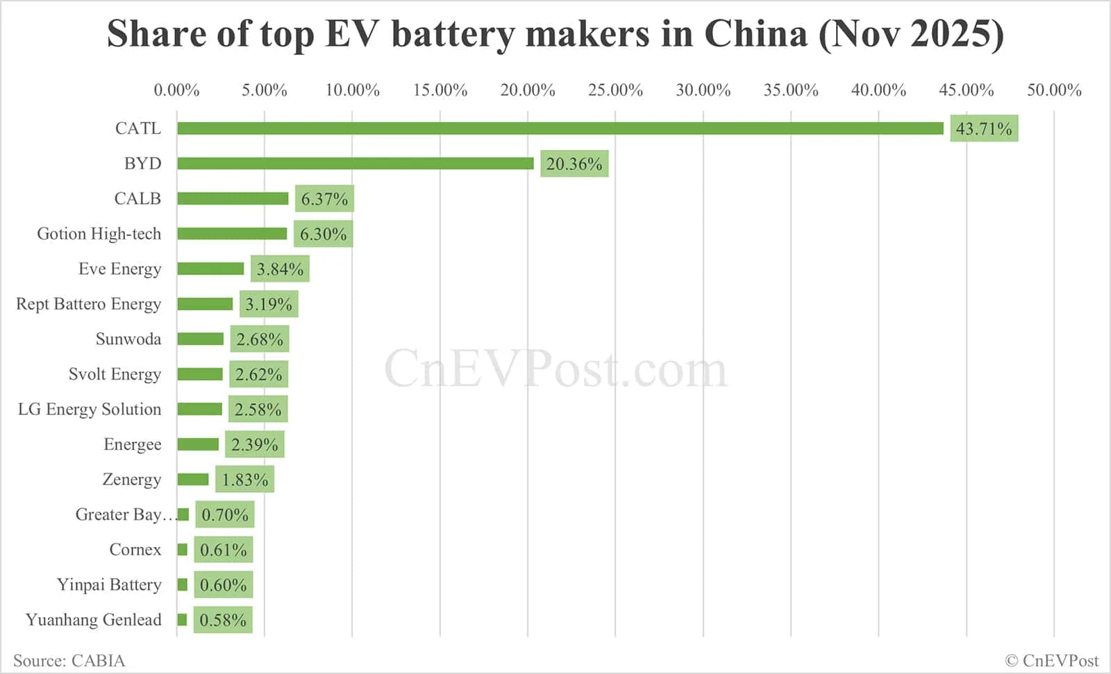 CATL maintained its top position with 40.87 GWh of battery installations in November, holding a 43.71 percent market share — an increase of 0.71 percentage points from its 43.00 percent share in October.