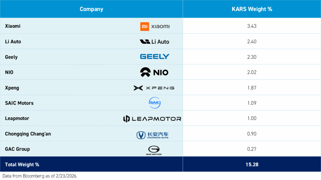 The KraneShares Electric Vehicles & Future Mobility Index ETF (KARS) is designed to provide exposure to the global EV and future mobility universe. KARS invests across global markets, including nine China-based automakers as of February 24, 2026.7