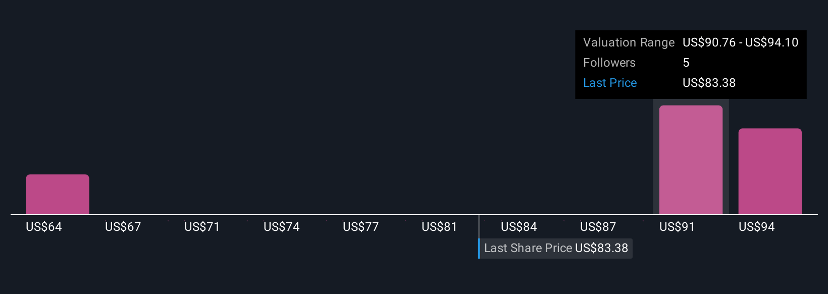 Four opinions from the Simply Wall St Community put Boyd Gaming’s fair value between US$64.03 and US$97.44. Amid this broad range, several market participants remain focused on near-term pressures from expectations of lower revenue and the implications for financial stability, consider exploring these different forecasts to inform your own view.