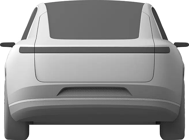The third was an executive sedan filed on February 8, 2023. The front features an inwardly recessed closed grille, narrow sharp headlights, a through-type light strip, and a trapezoidal grille in the bottom. The rear taillight design echoes that of the headlights. A roof lidar and hidden door handles are both present. The quarter glass is also smaller than the previous two designs.