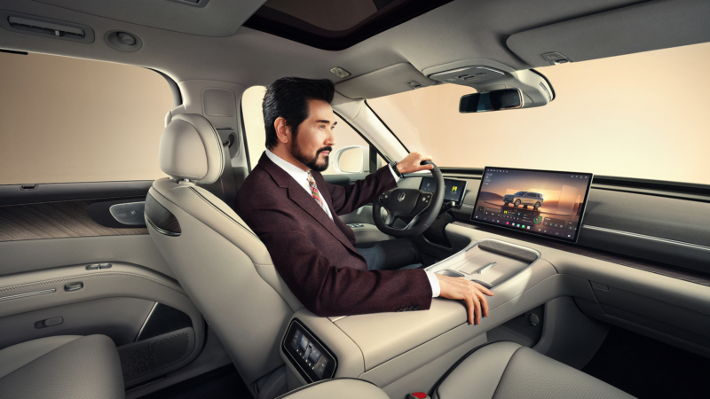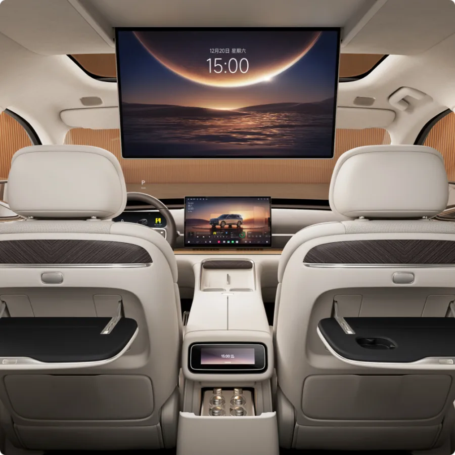 A 21.4-inch 3K ceiling entertainment screen for the rear passengers is also present.