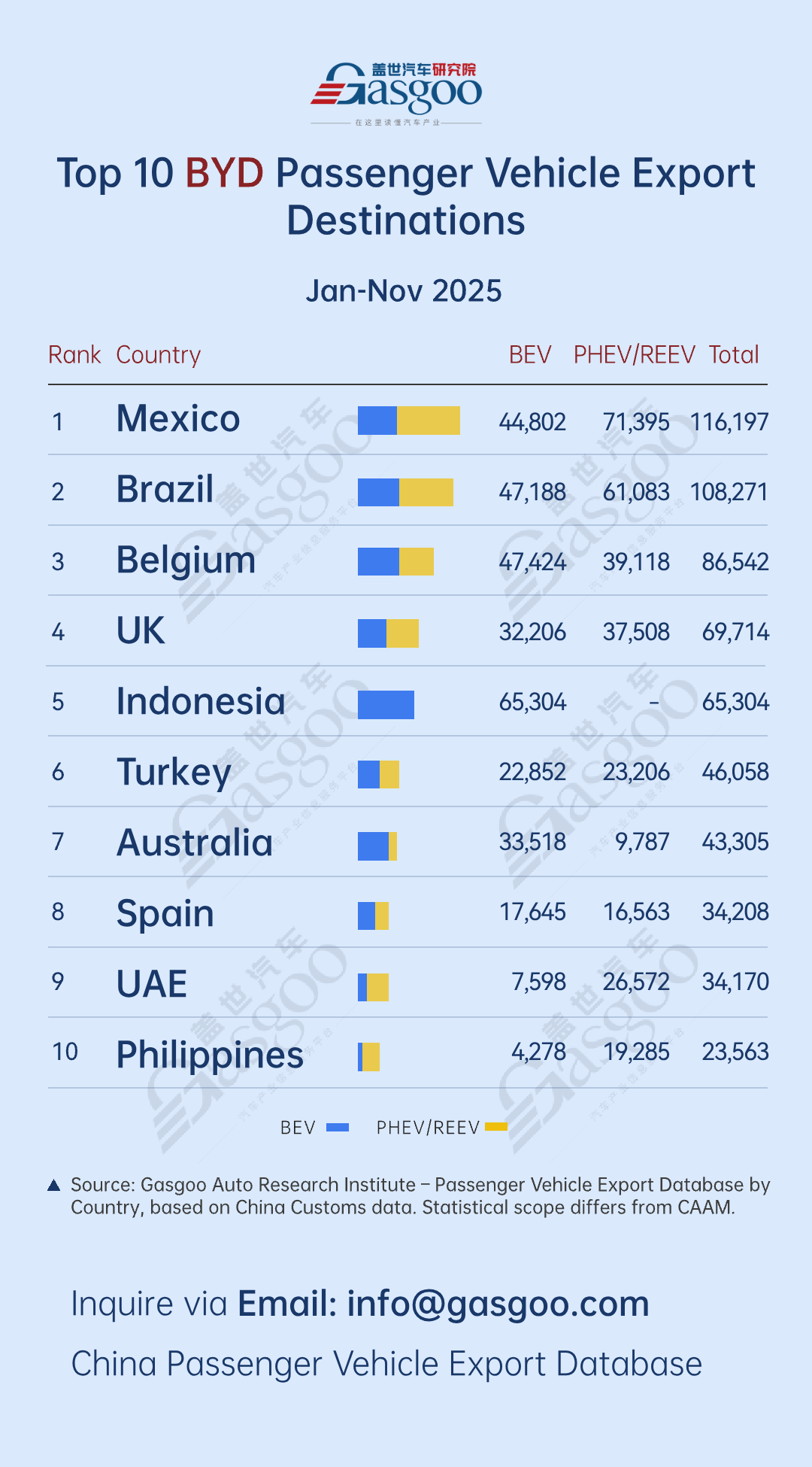 NO.1 Mexico: 44,802 battery electric passenger vehicles and 71,395 plug-in hybrid electric passenger vehicles were exported from January to November 2025, totaling 116,197 units.