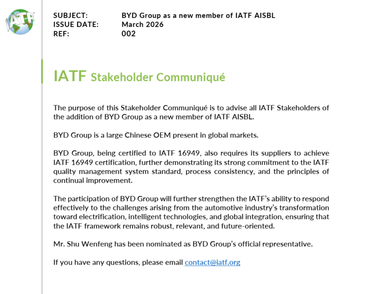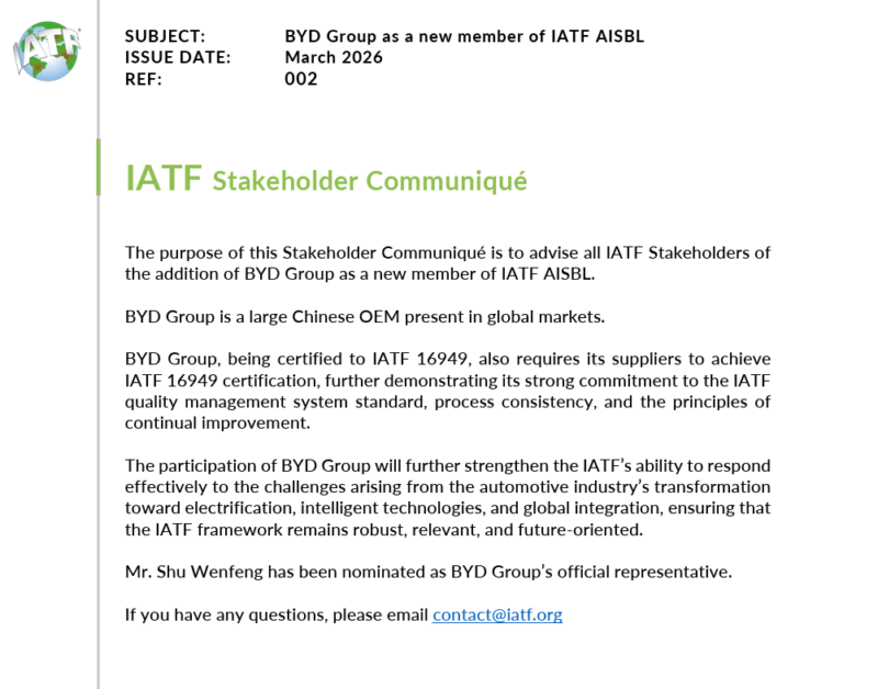 This move follows the precedent set by Geely, which became the first Asian IATF voting member in 2021. While Geely broke the long-standing Western monopoly, BYD’s entry into the IATF AISBL, a new legal entity formed on March 4, 2026, marks a shift toward governance in the electrification era. As the first Chinese brand in this new body, BYD will contribute technical expertise through its representative, Shu Wenfeng, to help shape future EV-centric quality frameworks.