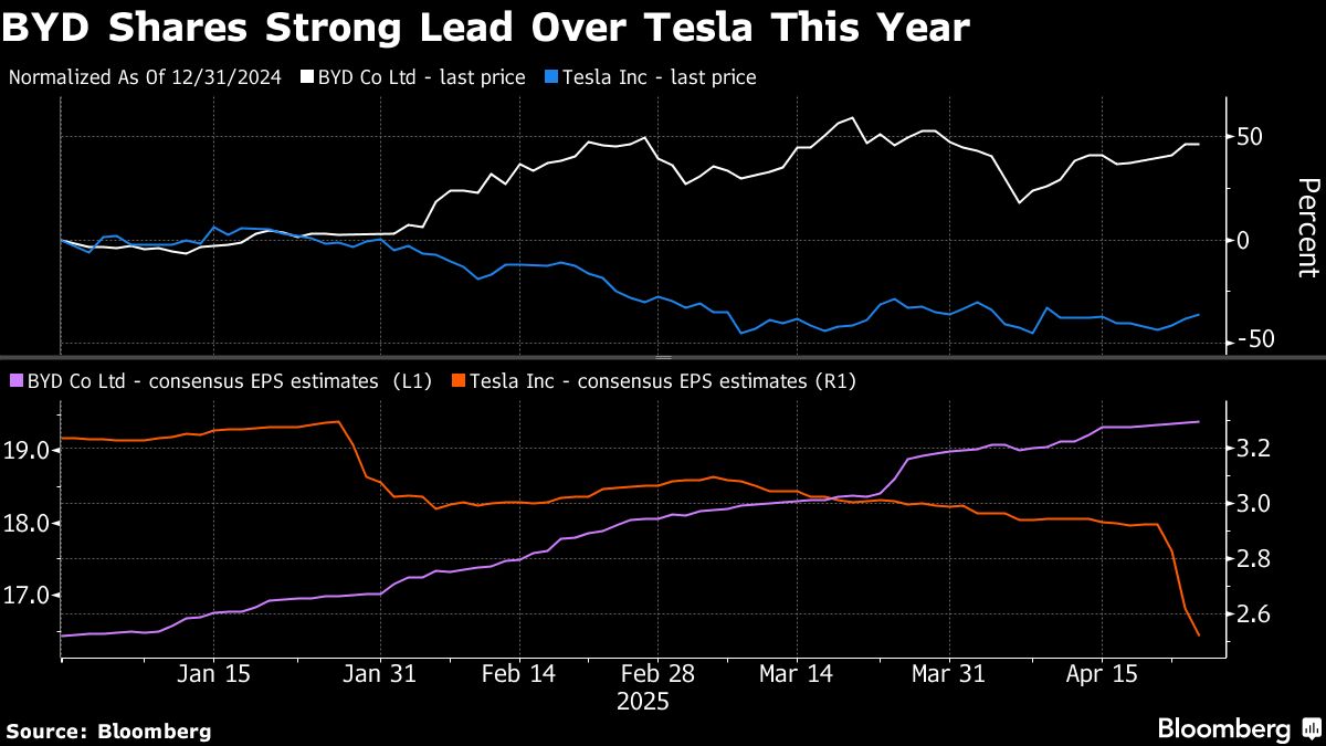 BYD Co. shares’ strong lead over Tesla Inc. this year may get another lift from the Chinese electric vehicle maker’s first-quarter results, expected to show a solid start to 2025.