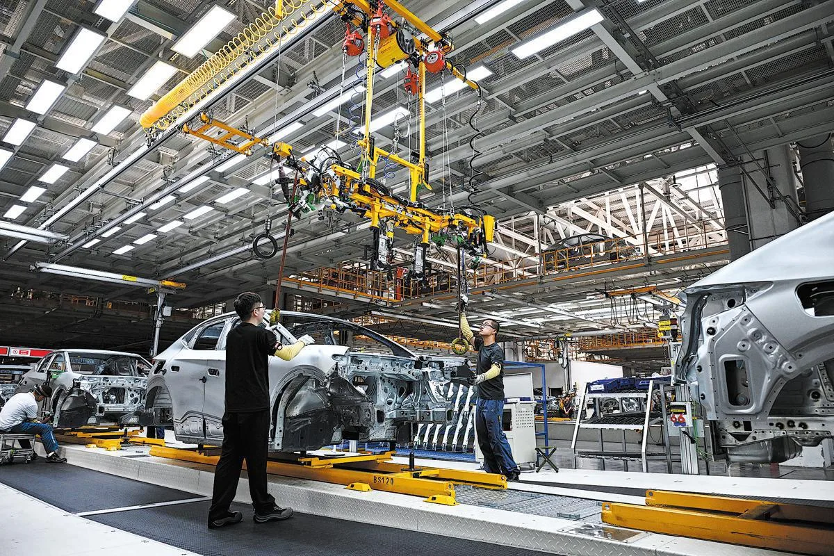 Workers and robotic arms operate at the production line of Volkswagen Anhui, the carmaker’s first electric vehicle joint venture in China, in Hefei, Anhui province, on May 21. [Photo provided to CHINA DAILY]