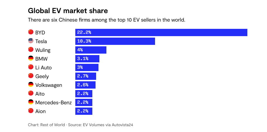 BYD isn’t the only player out of China; six of the world’s top 10 electric-vehicle sellers last year were Chinese and, according to the International Energy Agency, Chinese automakers now control 70% of global EV production.
