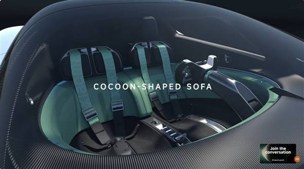 Inside, the cabin features a butterfly-shaped steering wheel, a panoramic display screen, and “cacoon shaped sofa”.